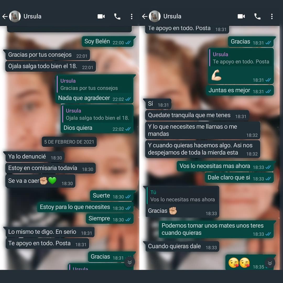 Debo confesarte que a veces me siento culpable y necesito decírtelo. En ocasiones tengo esa sensación horrible de que podría haber hecho algo más por vos, pero también estaba asustada y sólo quería irme para estar con mis hijos. No puedo explicarte lo que sentía cuando me mostrabas cada foto que guardabas en el celular: los golpes, los moretones, los pelos que te arrancó, las manos lastimadas… Esa violencia también dolía en mi cuerpo. Te prometí que te acompañaría, estuve y seguiré estando, aunque sé que no alcanzó; mientras te escuchaba decir que Matías te iba a matar, por dentro sabía que era cierto, porque lo conocí y porque también sufrí sus amenazas, sus empujones y hasta su arma reglamentaria apuntándome, porque lo denuncié en 2017 e igual aparecía por mi trabajo y no pude volver a mi casa por dos meses. Yo me pude escapar porque mis hermanos y mi familia siempre estuvieron cerca para defenderme, por eso decidí ayudarte a hacer la denuncia y me alegré mucho cuando al día siguiente, el viernes, me mandaste “Ya lo denuncié”, con la confianza de que “¡Se va a caer!”. Y ahí volvieron los insultos porque te juntaste conmigo, las amenazas de que nos iba a matar a las dos; qué difícil todo lo que viviste, Úrsula. No podías hacer nada sin que él lo supiera, es imposible vivir si padecés a alguien que te persigue y sabe cada movimiento tuyo, que te inunda de mensajes advirtiéndote lo que hará.