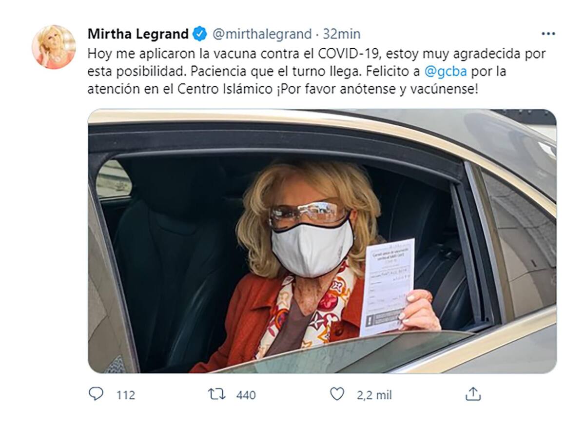“Hoy me aplicaron la vacuna contra el COVID-19, estoy muy agradecida por esta posibilidad. Paciencia que el turno llega. Felicito a @gcba por la atención en el Centro Islámico ¡Por favor anótense y vacúnense!”, expresó la diva en su cuenta de Twitter.