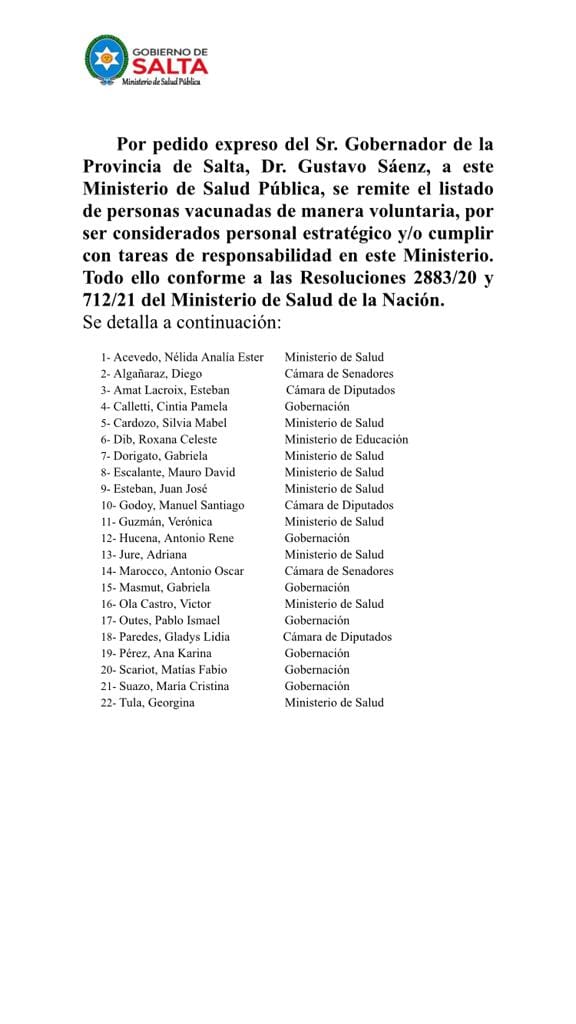 La lista lleva la firma del Ministro de Salud de la provincia, Juan José Esteban y revela 22 nombres entre los que se encuentran funcionarios y legisladores.