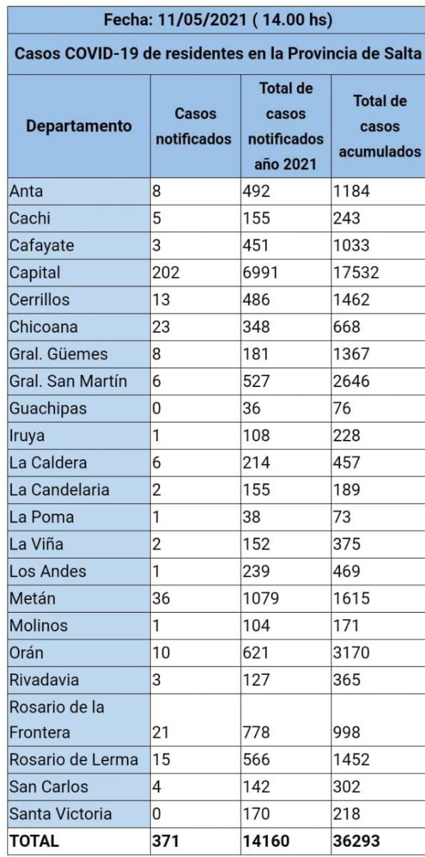 El Ministerio de Salud Pública informa que se notificaron 371 casos nuevos en la provincia, de los cuales 329 corresponden a muestras procesadas por laboratorio y 42 definidos por criterio clínico epidemiológico.