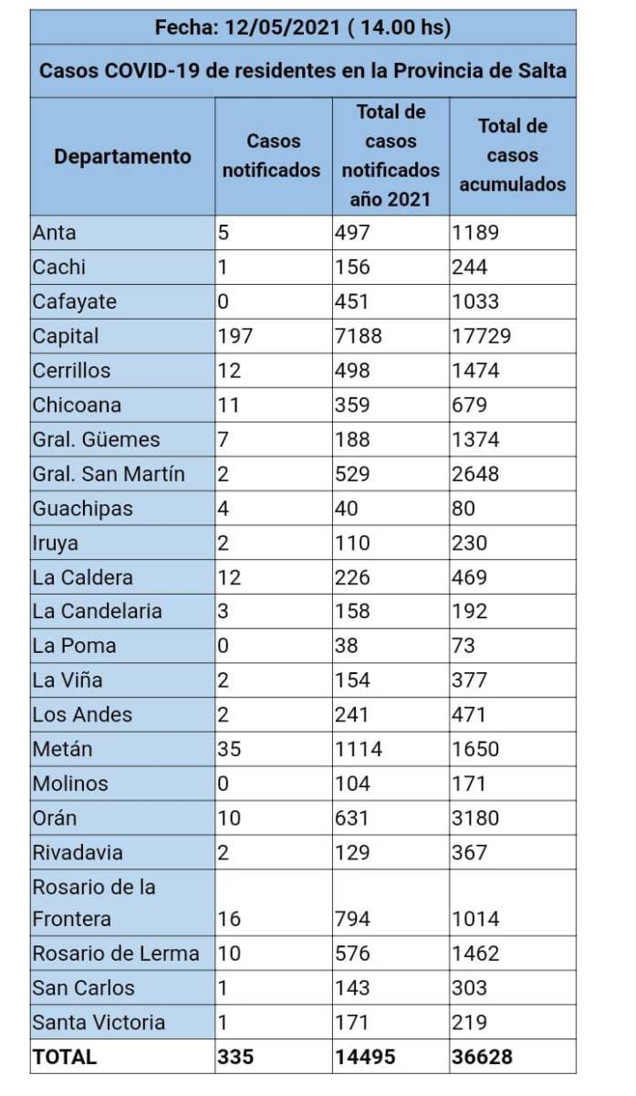 El Ministerio de Salud Pública informó que se notificaron 335 casos nuevos en la provincia, de los cuales 314 corresponden a muestras procesadas por laboratorio y 21 definidos por criterio clínico epidemiológico.