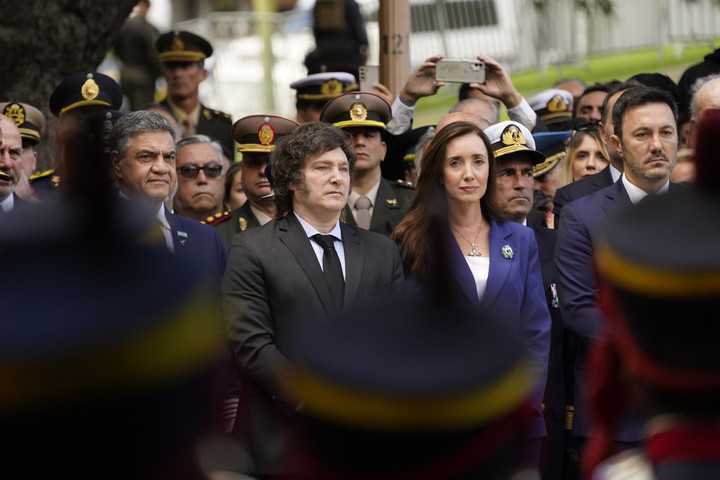 Durante la actividad, que se llevó a cabo en el Cenotafio de la Plaza San Martín y fue transmitido por cadena nacional, estuvo acompañado por la vicepresidenta, Victoria Villarruel, con quien mantuvo algunos cortocircuitos en las últimas semanas.