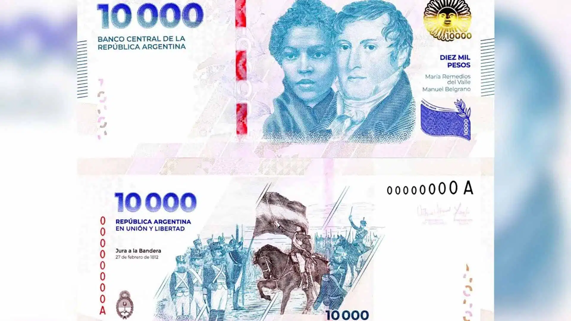 En cuanto a las medidas de seguridad, el nuevo billete de $10.000 cuenta con rigurosas características incorporadas mediante sistemas de impresión especiales. Estas incluyen una marca de agua con los retratos de María Remedios del Valle y Manuel Belgrano, así como iniciales de sus nombres en tono claro, visible al observar el billete al trasluz.